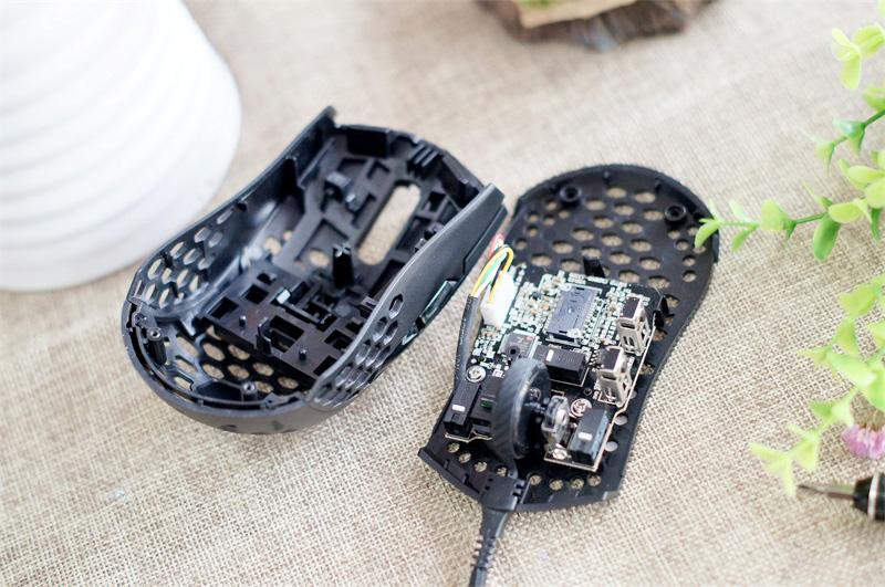 拆开看看,从这个角度能跟直观看到鼠标外壳上的所有洞洞,想要拆鼠标,需要去掉鼠标底部两个小块的低阻脚垫,所以才会送了一套替换用的脚垫。而因为洞洞的存在,鼠标进灰、进水的几率要大于其它鼠标,届时拆鼠标是必然的。