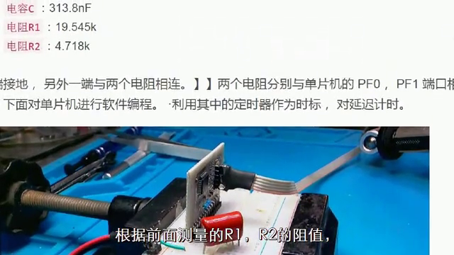 下面利用F030单片机的PFO、PF1两个管脚来测量电阻,测试一下这种方式测量的精度。实验中需要一个电容和两个电阻,电容容值为313.8nF,电阻1的阻值为19.545kQ,电阻2的阻值为4.718kQ。将它们安装在面包板上进行测试。